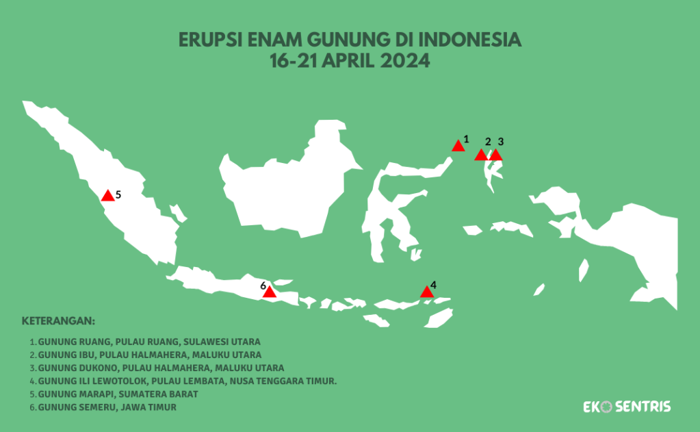 Ini belum semuanya. Gunung Marapi di Sumatera Barat yang sempat erupsi besar pada akhir tahun lalu, kembali meletus pada kamis pekan lalu, diikuti oleh Gunung Semeru di Jawa Timur, keesokan harinya. Hingga Ahad, 21 April kemarin, enam gunung ini masih melepaskan erupsi-erupsi kecil.