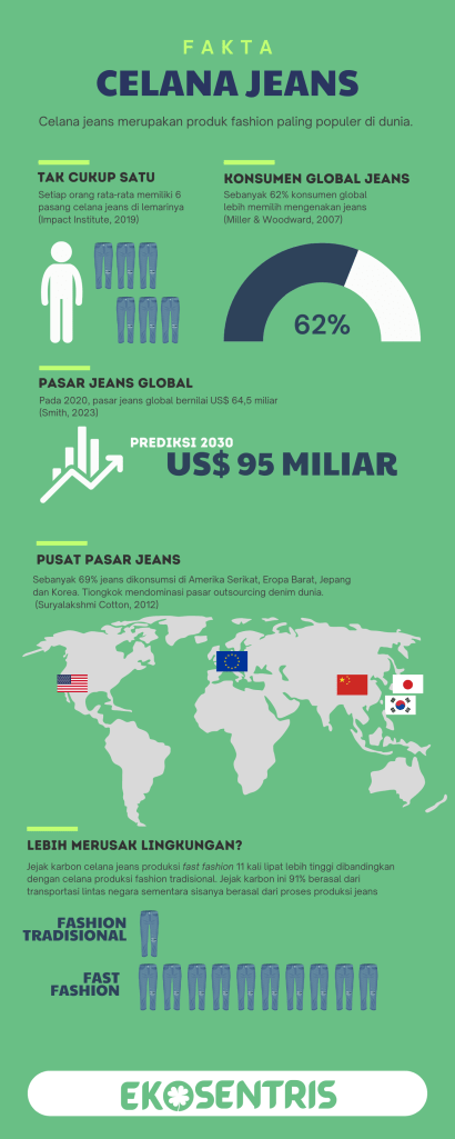 Tapi penelitian terbaru menyebutkan bahwa celana jeans—khususnya produksi industri fast fashion (mode cepat) memiliki jejak karbon lebih tinggi 11 kali lipat dibandingkan dengan celana produksi tradisional.
